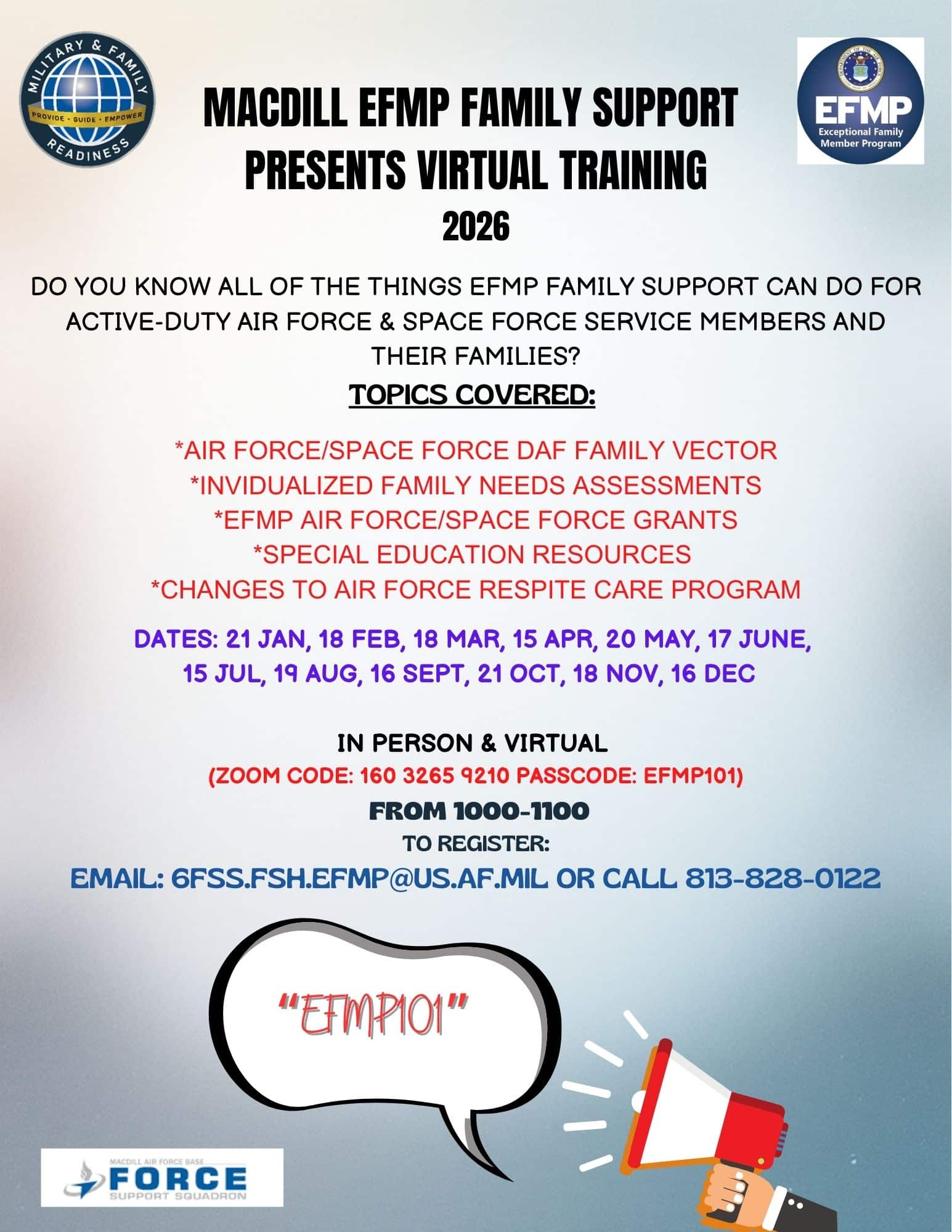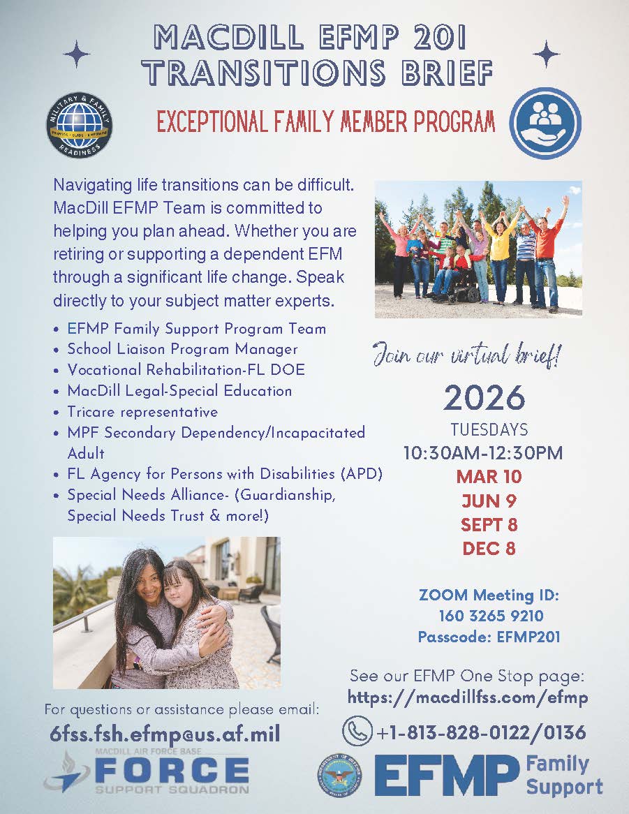 EFMP Family Support (FS) is provided by two coordinators located at the Military & Family Readiness Center (M&FRC). They provide services to all DoD ID cardholders assigned to the installation or located in the community, who have dependents with special needs. Their mission is to enhance the quality of life of EFMP families through non-medical case management, community/base information and referrals, education, networking events and other services. Their services are appropriate for people of ALL ages and all levels of need.