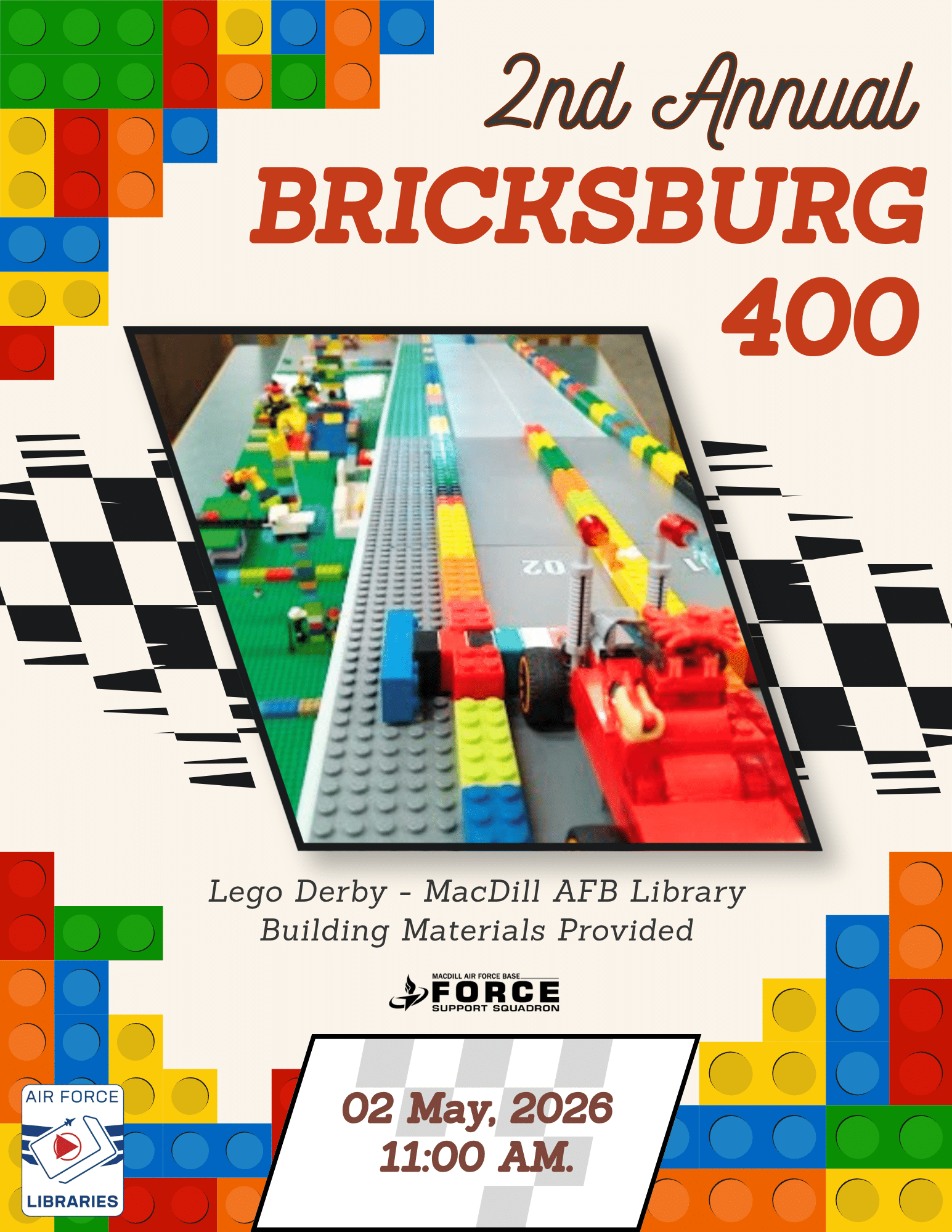 Rev up your creativity and join us at the MacDill Library for the 2nd Annual Bricksburg 400 on May 2 at 11 AM! Design, build, and race your very own LEGO Derby car in this fun, hands-on event for all ages.