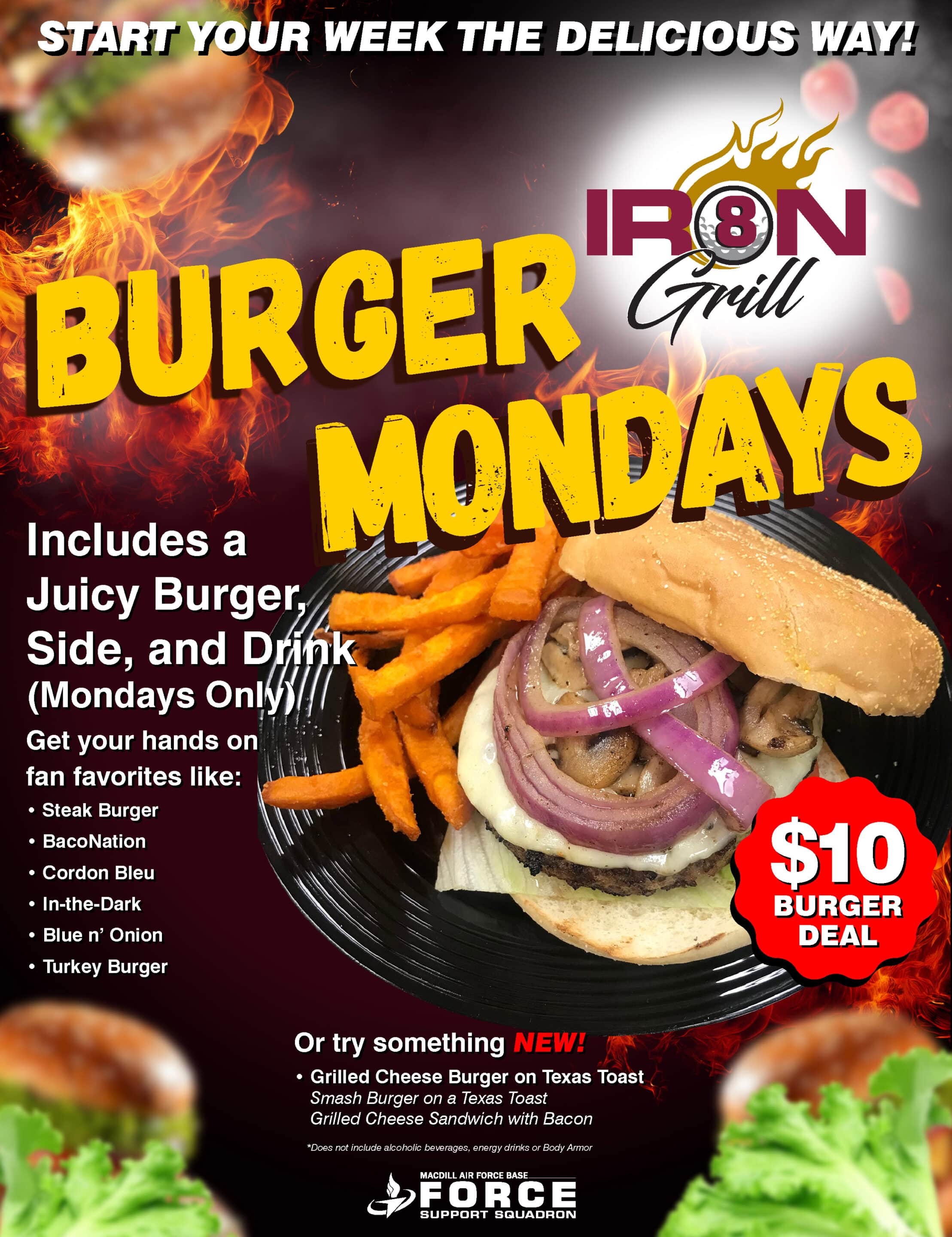 2 events,Burger Mondays are here at 8 Iron Grill! Just $10 for a juicy burger, side & drink Choose from: Steak Burger, Baconation, Cordon Bleu, In-the-Dark, Blue n Onion, or Turkey Burger Fresh, flavorful, and made to satisfy Perfect way to kick off your week! Don’t miss out—grab your crew and treat yourself every Monday!