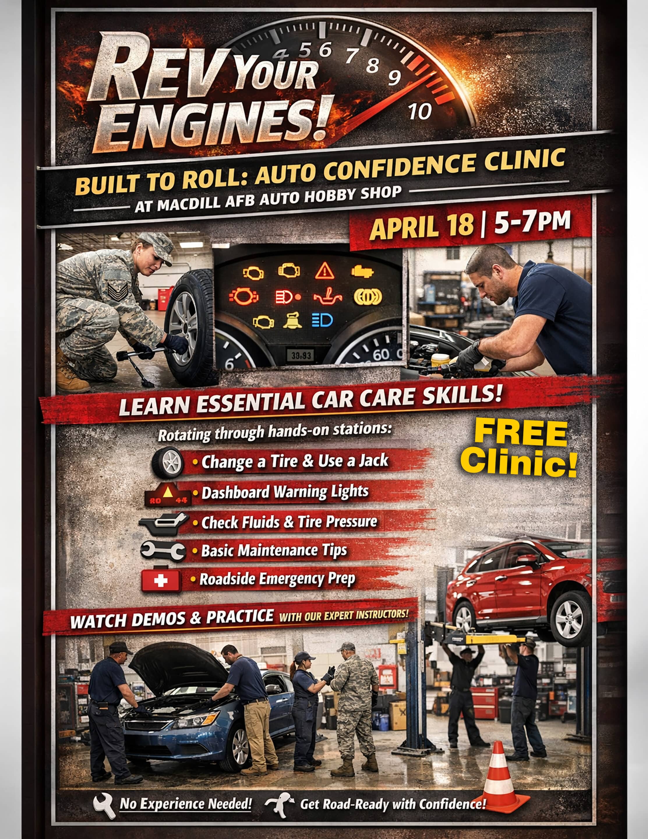 Rev Your Engines! Auto Confidence Clinic At MacDill AFB Auto Hobby Shop | April 18 | 5–7 PM Learn hands-on car care skills with expert instructors Practice tire changes, dashboard warnings, fluids & more Get prepared for roadside emergencies No experience needed—just bring yourself! Get road-ready with confidence! |