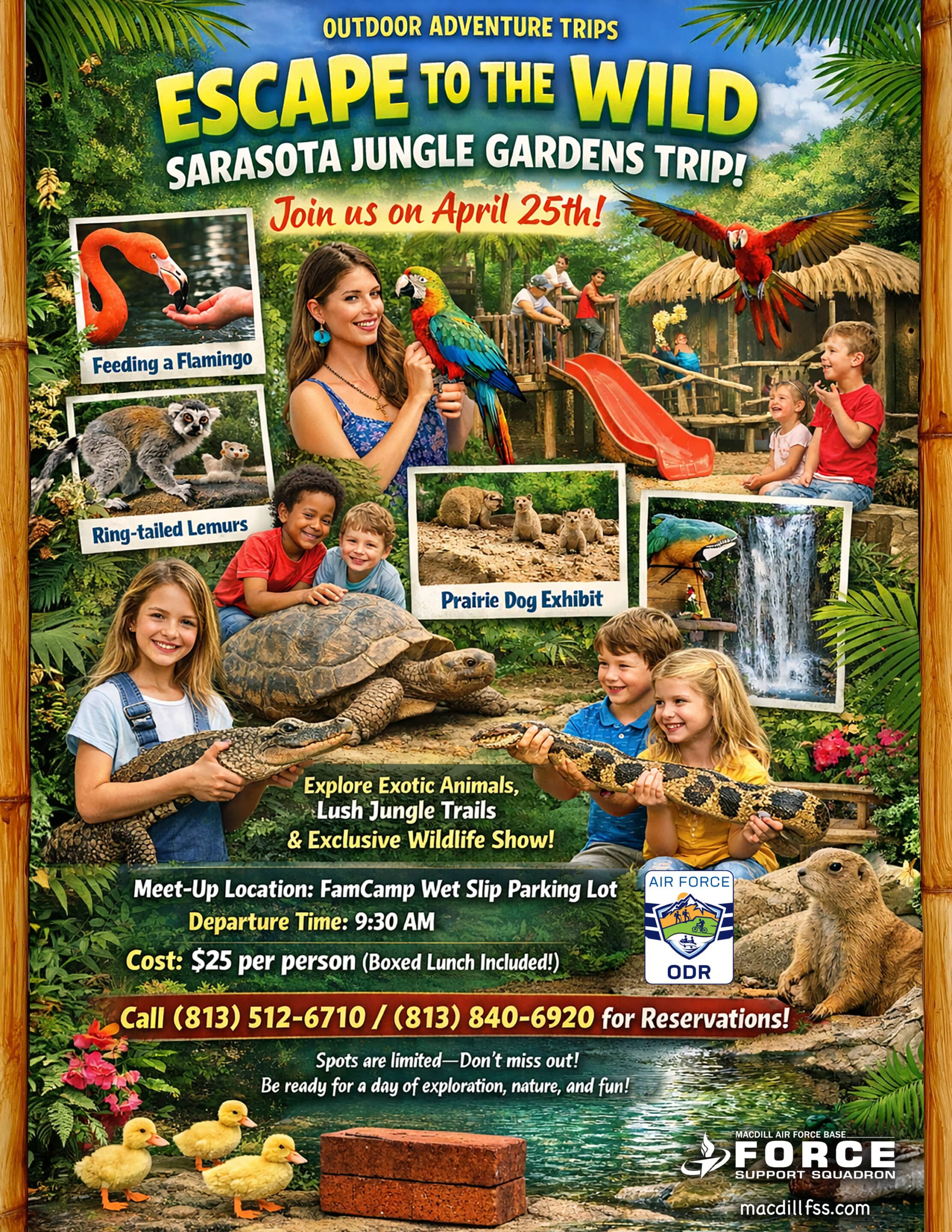 Escape to the Wild! Get ready for an unforgettable adventure at the Sarasota Jungle Gardens on April 25! Explore lush jungle trails, meet incredible animals, and enjoy an exclusive wildlife show with Outdoor Adventure Trips. Trip Highlights: Exotic animal encounters (flamingos, lemurs & more!) Scenic jungle exploration Private wildlife experience Boxed lunch included Meet-Up: FamCamp […] |