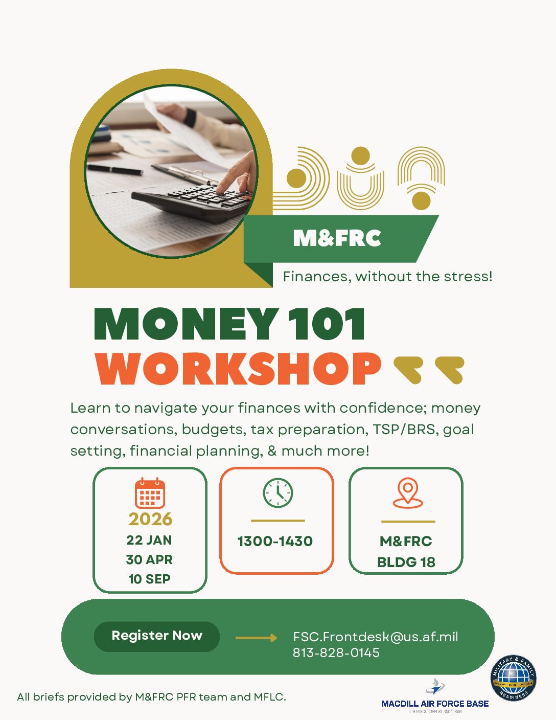 1 event,Take control of your finances with confidence Join us for the M&FRC: Money 101 Workshop and build a strong foundation for your financial future! Learn about budgeting, tax prep, TSP/BRS, goal setting, financial planning, and how to navigate important money conversations. 2026 Dates: Thursday, April 30 & Thursday, September 10 Time: 1:00 – 2:30 PM […] |